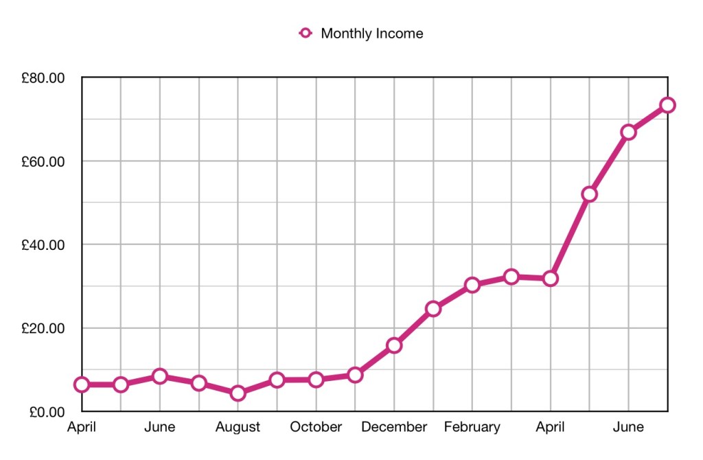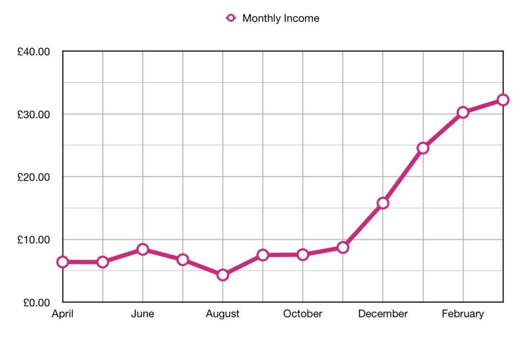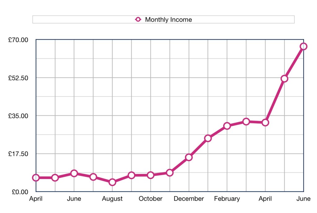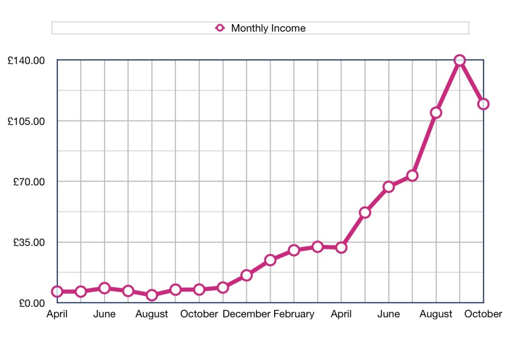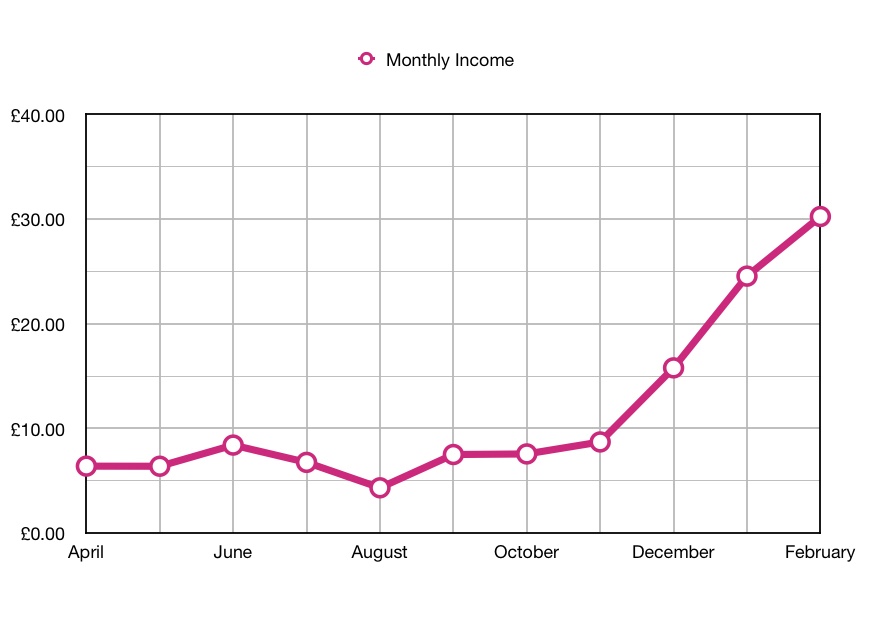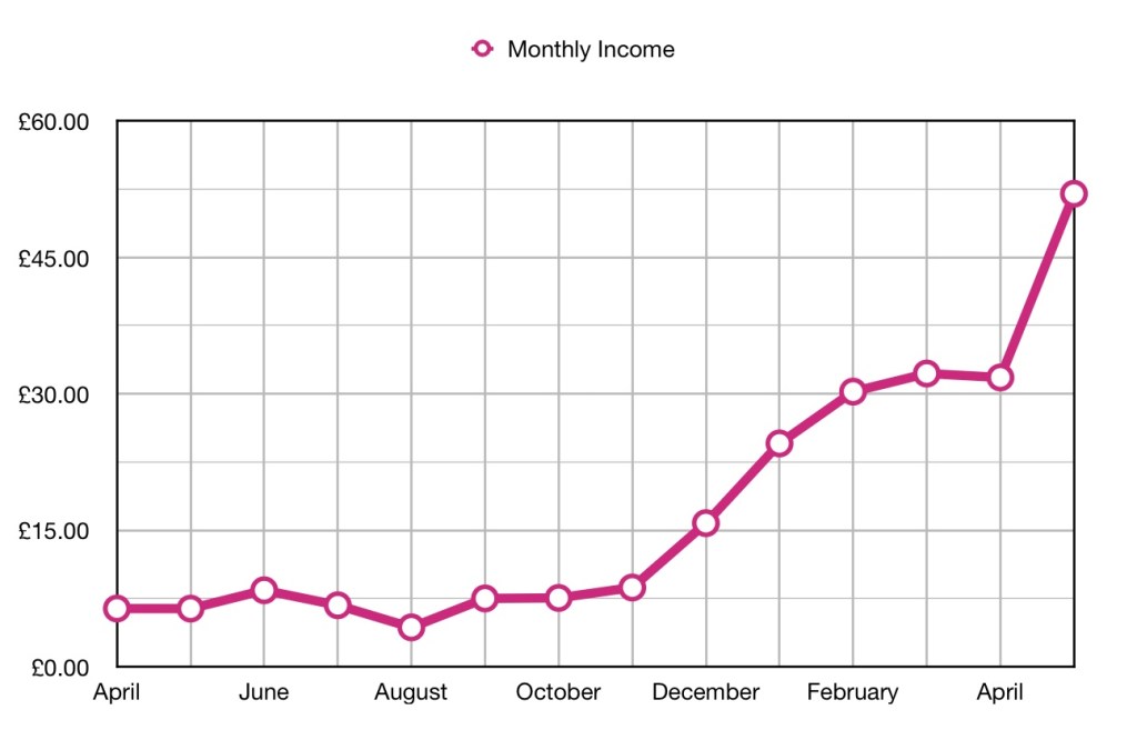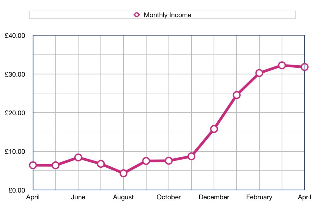 Although there has been a significant drop in income this month it is still my second best month, so maybe it is more a factor of how good last month was. Will I make £150 next month. Not sure…