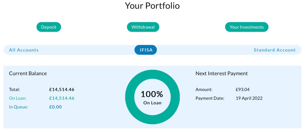 As you can see, the earnings are regular and steadily increasing as my assets under management increase. The monthly interest should pass the £100 in the next month or so. Moving forward I am going to invest my 2022-2023 IFISA in Elfin Market, the same as last year. That should bring my monthly income to around £200 by April 2023